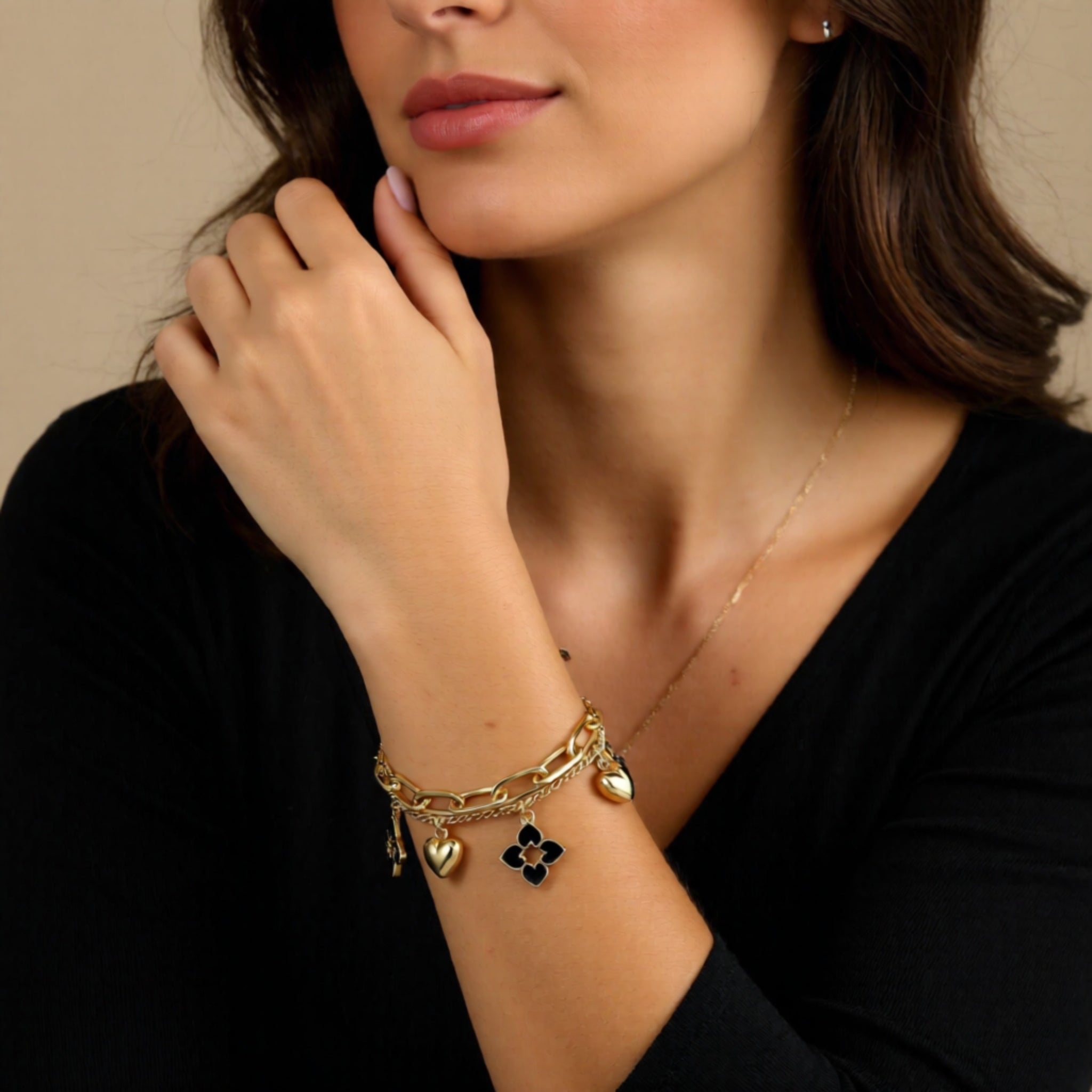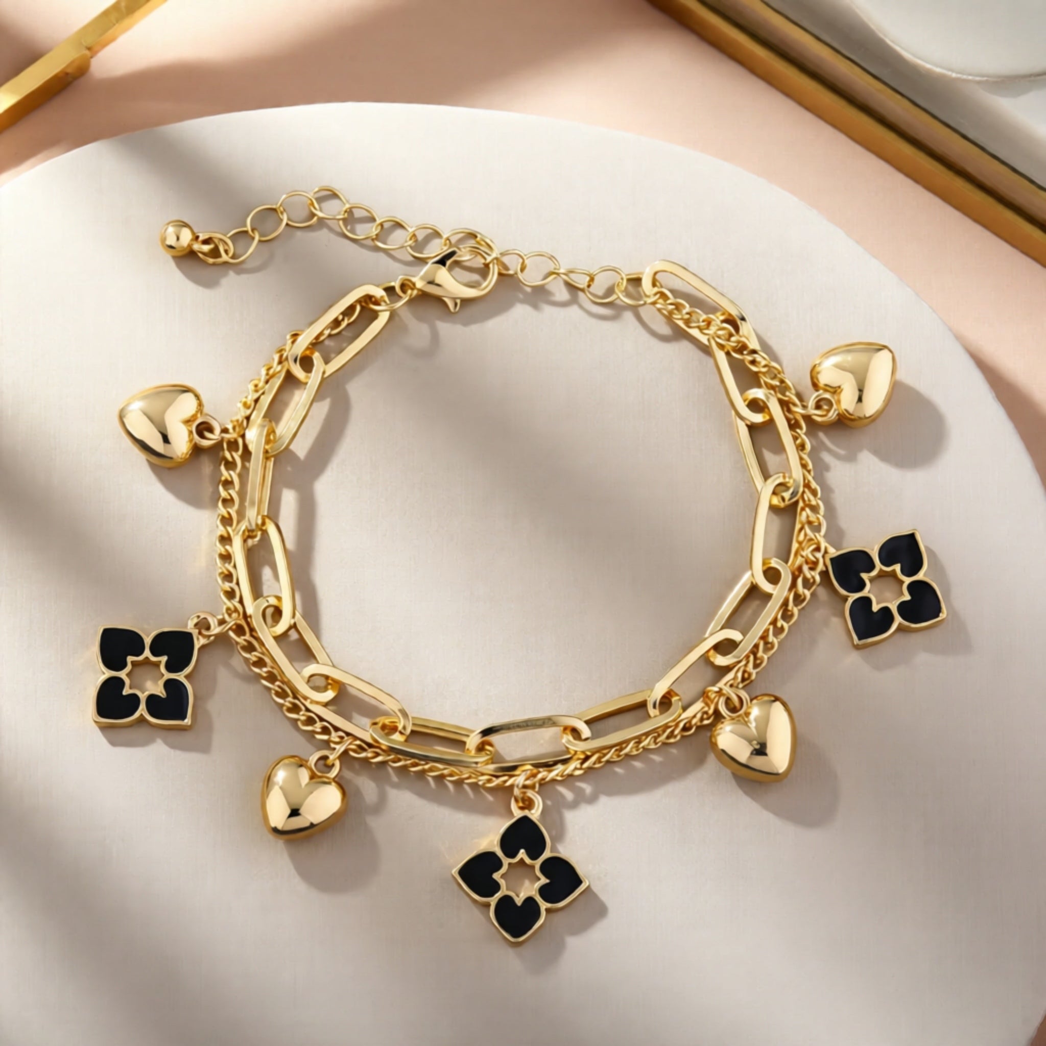 Add a touch of grace to your wrist with the Elegant Double Layer Charm Bracelet, a stunning blend of golden-tone metal and black floral accents. Featuring heart and clover charms, this bracelet beautifully symbolizes love, luck, and positivity. The double-layer design gives it a luxurious, textured look—perfect for women who appreciate refined beauty with a hint of playfulness. Whether paired with casual wear or an evening dress, this bracelet effortlessly elevates your style with its delicate yet striking appeal.