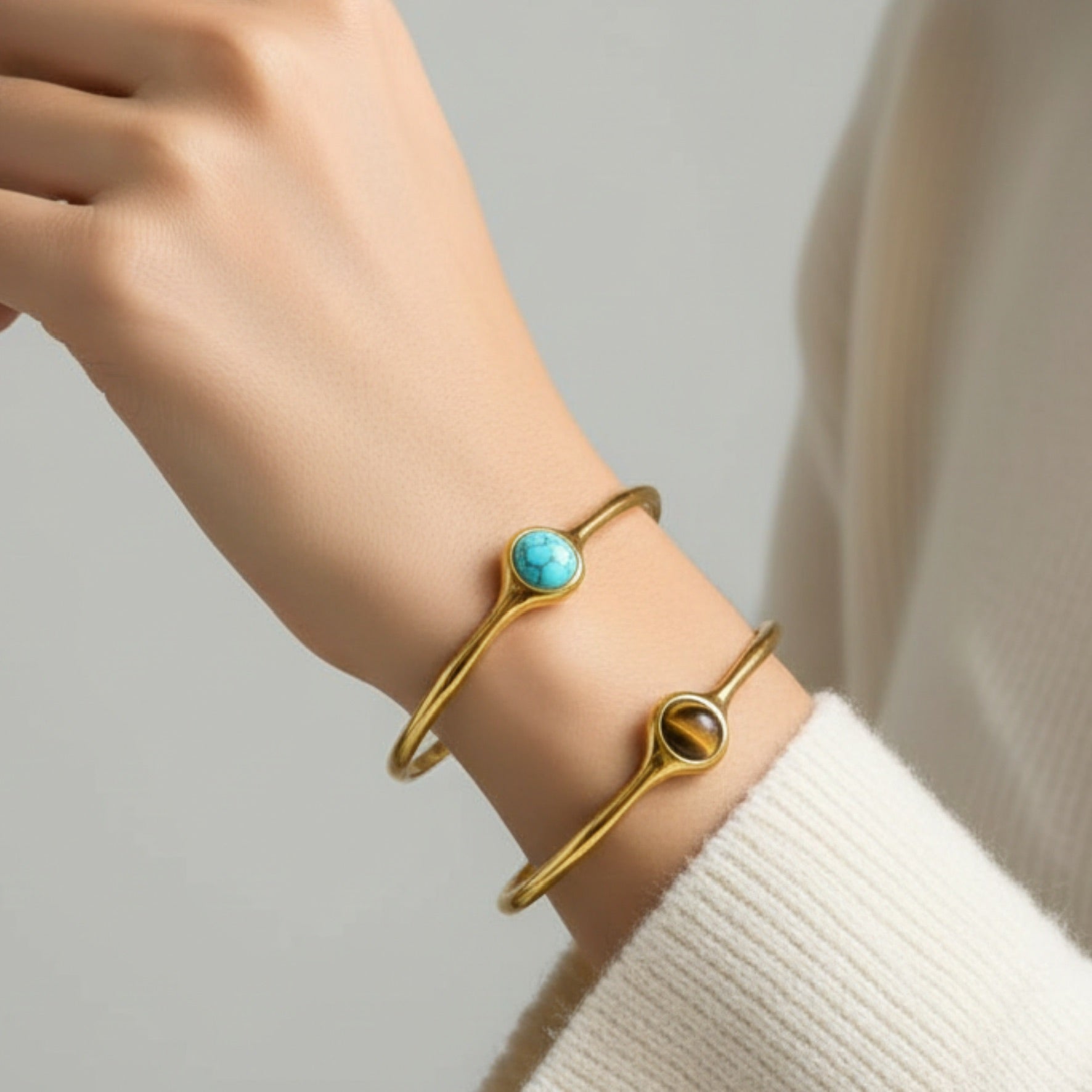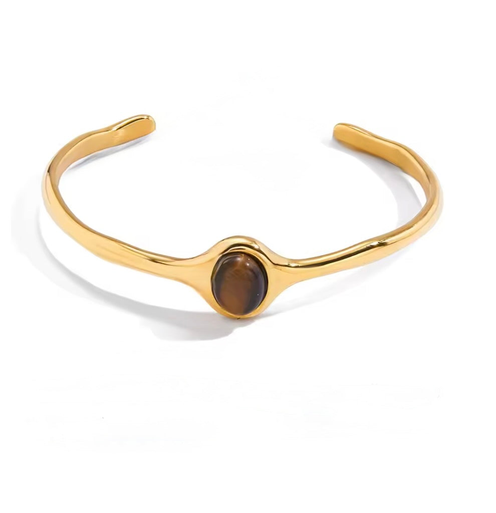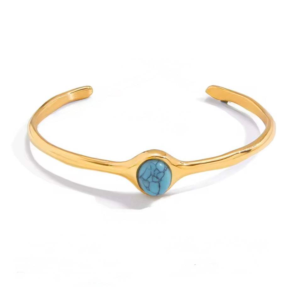 Add a touch of vintage elegance to your jewelry collection with this oval Tiger Eye cuff bangle, designed to blend timeless charm with modern durability. Featuring a striking oval Tiger Eye–style stone in rich blue turquoise tones, this bracelet is framed by a sleek 18K gold color plated stainless steel cuff for a refined, eye-catching look.
