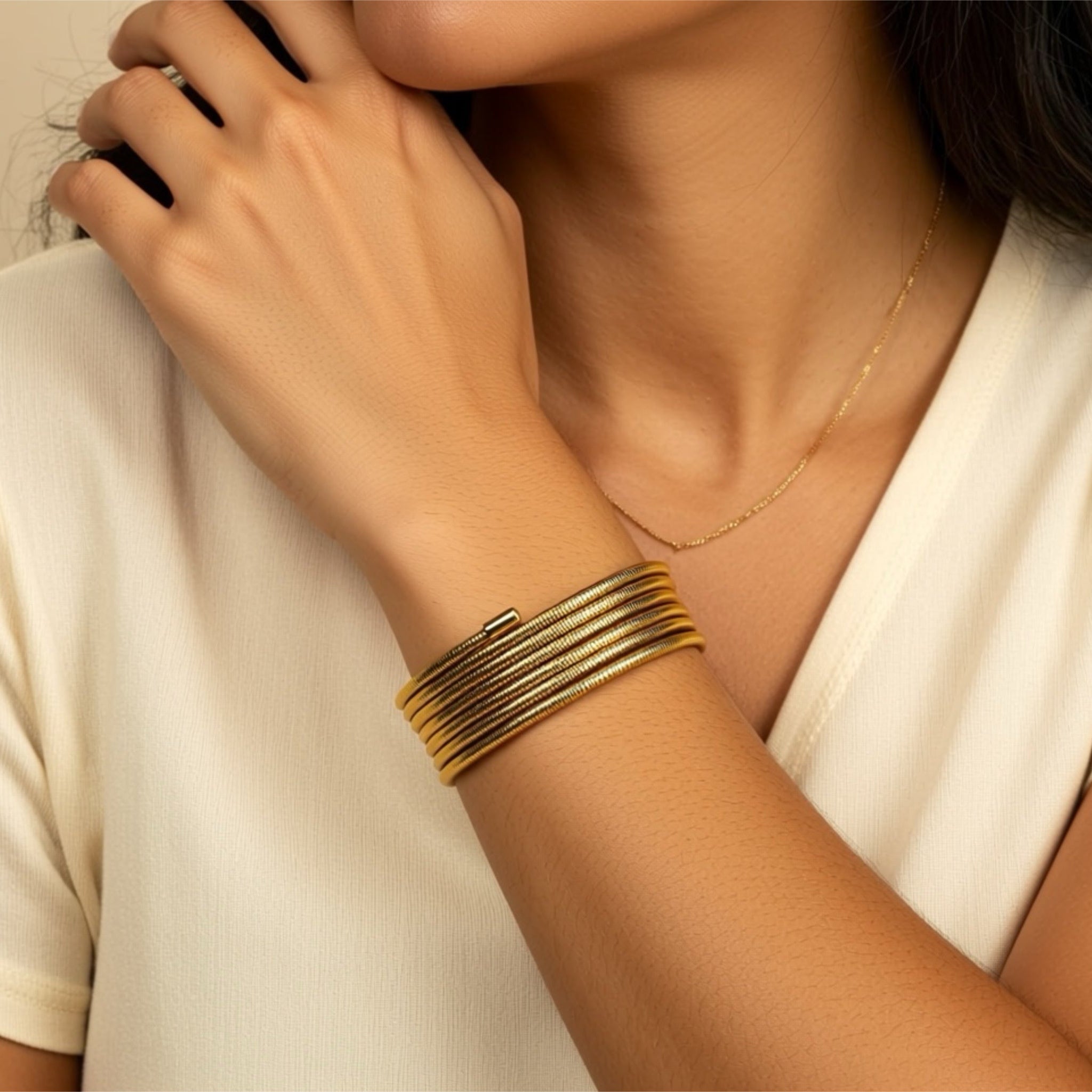 Crafted from durable stainless steel, it is waterproof, tarnish-resistant, and built for long-lasting shine. The elastic design ensures a comfortable fit, making it easy to slip on and off while adapting naturally to your wrist. Its unisex style makes it perfect for women and anyone who appreciates contemporary, minimalist metal jewelry.