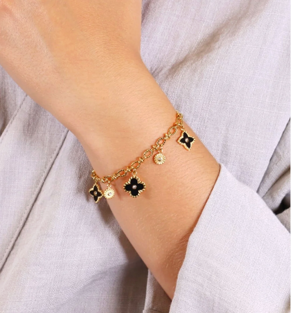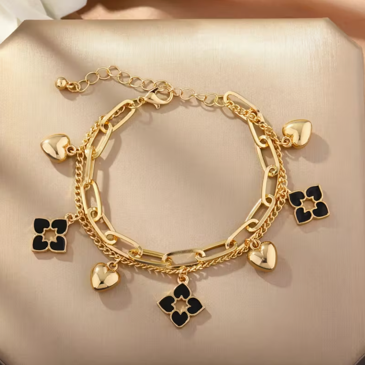 Add a touch of grace to your wrist with the Elegant Double Layer Charm Bracelet, a stunning blend of golden-tone metal and black floral accents. Featuring heart and clover charms, this bracelet beautifully symbolizes love, luck, and positivity. The double-layer design gives it a luxurious, textured look—perfect for women who appreciate refined beauty with a hint of playfulness. Whether paired with casual wear or an evening dress, this bracelet effortlessly elevates your style with its delicate yet striking appeal.