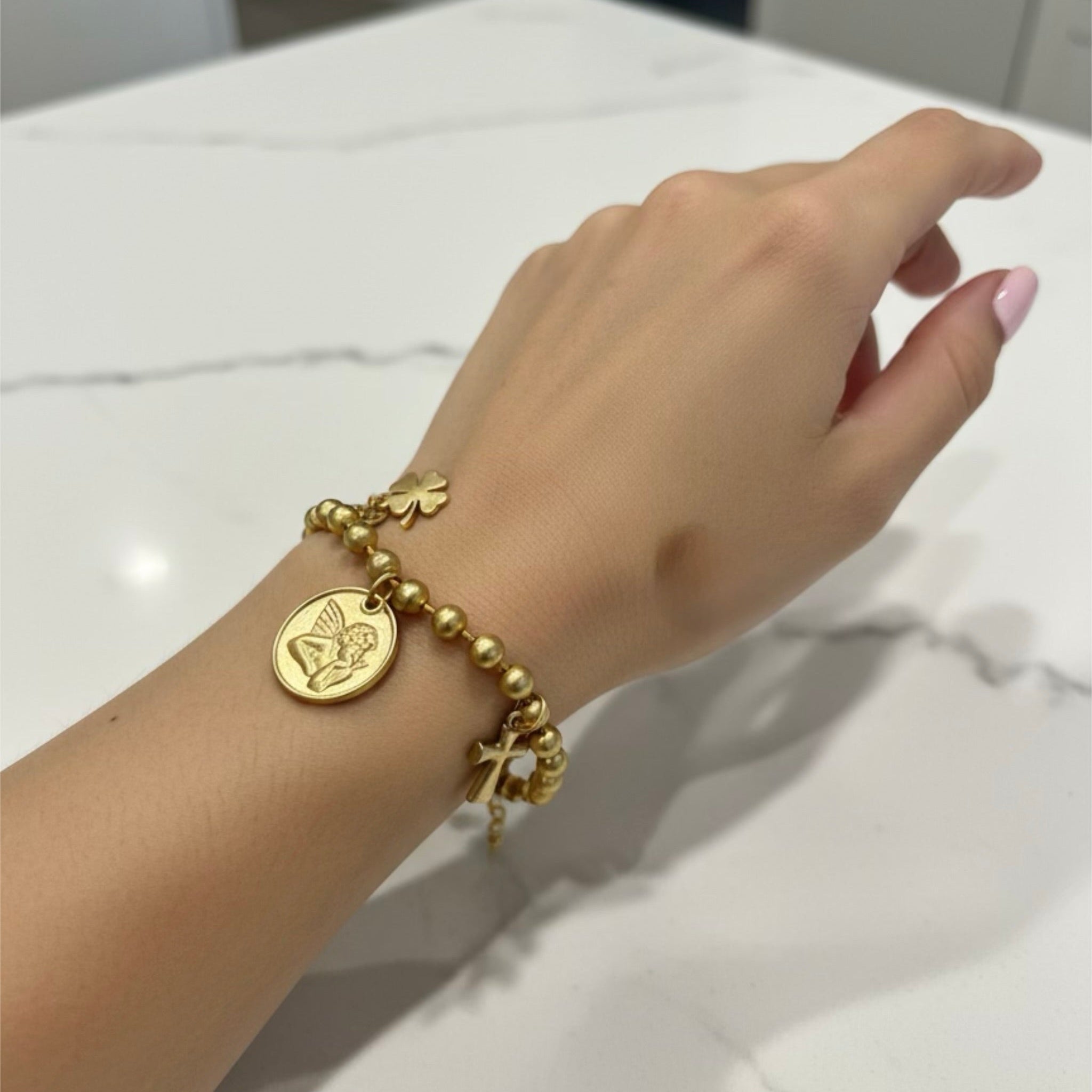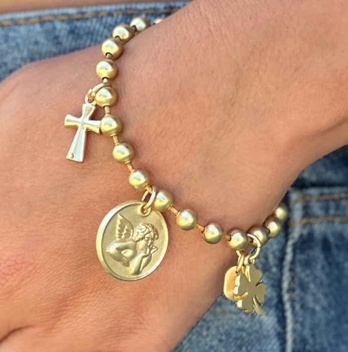 Add a touch of playful luxury to your jewelry collection with the Snowball Mix Charm Bracelet in Gold. Designed to delight at every glance, this bracelet features a mix of snowball-inspired charms that bring sparkle, texture, and movement to your wrist. The warm gold-tone finish gives it a rich, radiant glow, making it a perfect accessory for women who love fun fashion elevated with sophistication. Whether you're dressing up a cozy winter look or elevating your everyday outfits, this bracelet delivers effortless charm all year long.
