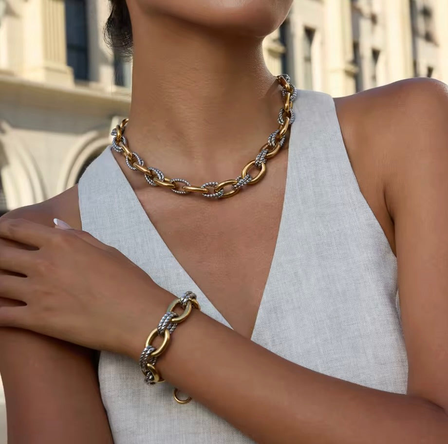 Turn every outfit into a statement with the Stainless Steel Two Color Design Necklace, beautifully plated in 18K gold. This stunning piece blends silver and gold tones in a unique twisted splicing pattern, symbolizing harmony and balance. Designed for women who appreciate fine craftsmanship and modern luxury, this necklace effortlessly enhances your everyday style—whether you’re dressing for work, a special night out, or simply elevating your casual look. The luxurious dual-tone finish ensures it complements any outfit, making it a versatile must-have in your jewelry collection.