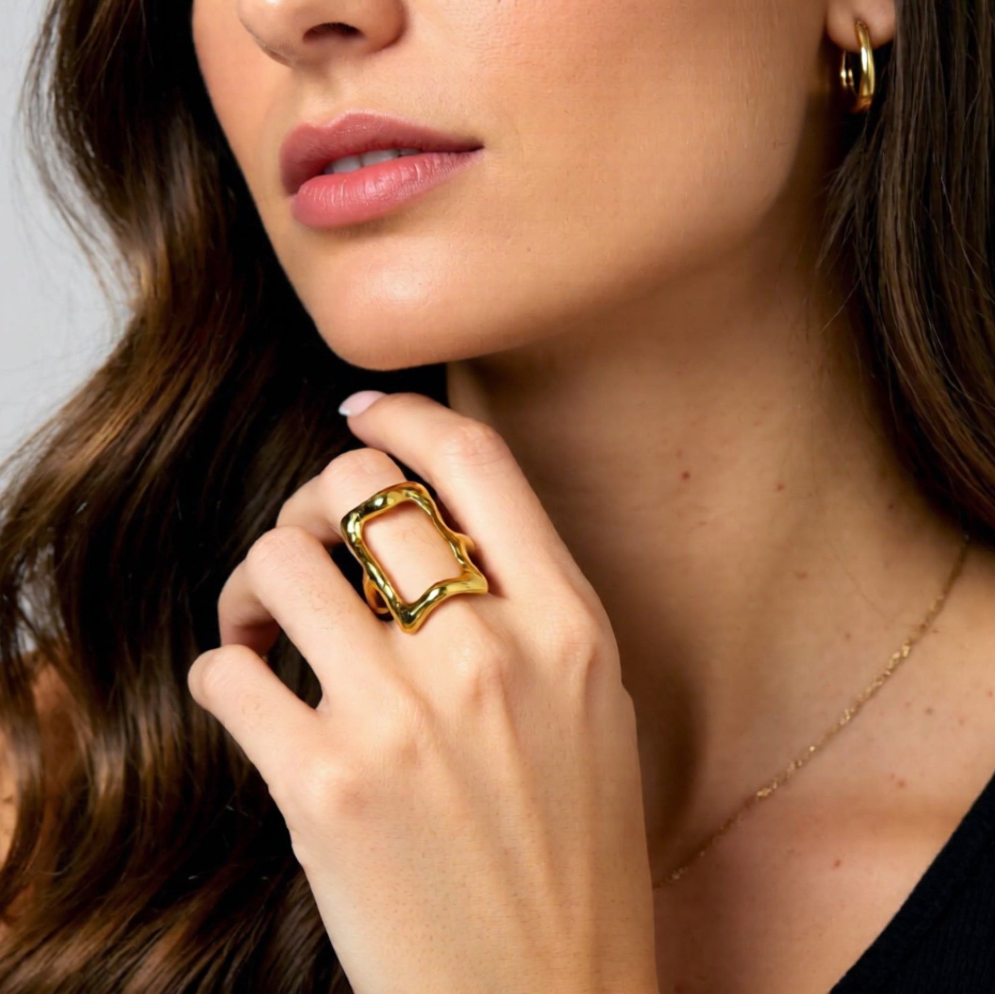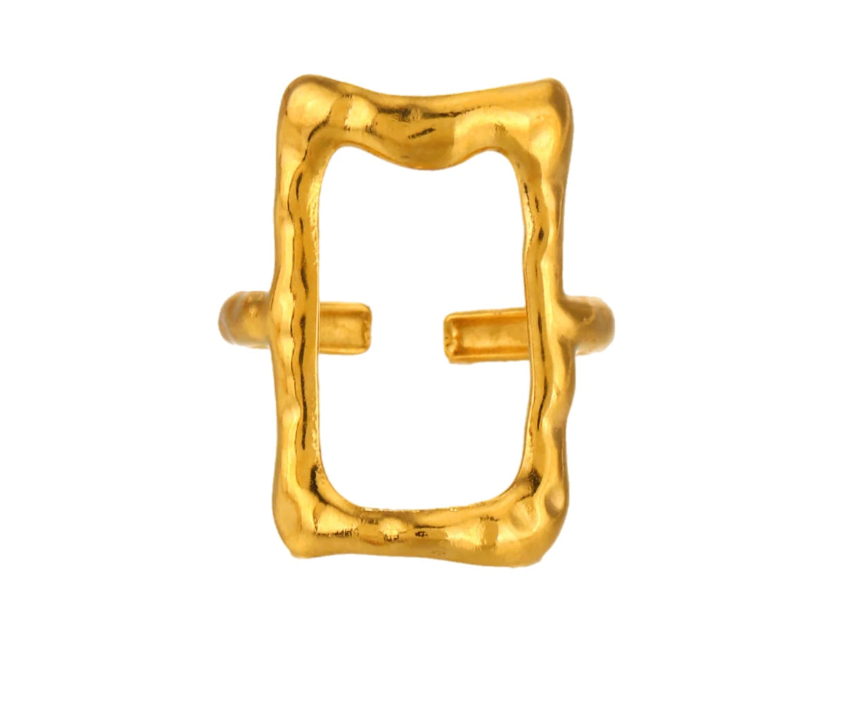 Make a modern statement with this gold-plated steel rectangular open ring, a bold and contemporary piece designed for women who love minimalist yet striking jewelry. The geometric open rectangle design creates a sleek architectural silhouette that adds a touch of sophistication to any outfit.