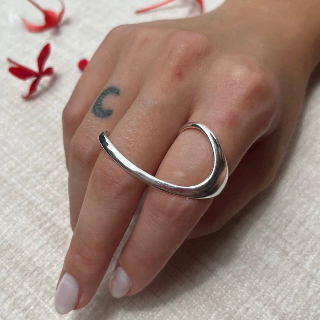 Unleash your fearless style with this Sterling Silver Chunky Two-Finger Ring, crafted for women who love jewelry that turns heads and speaks confidence. Featuring a striking irregular geometric silhouette and a smooth, open adjustable band, this sculptural piece effortlessly spans two fingers, creating a powerful and luxurious statement.