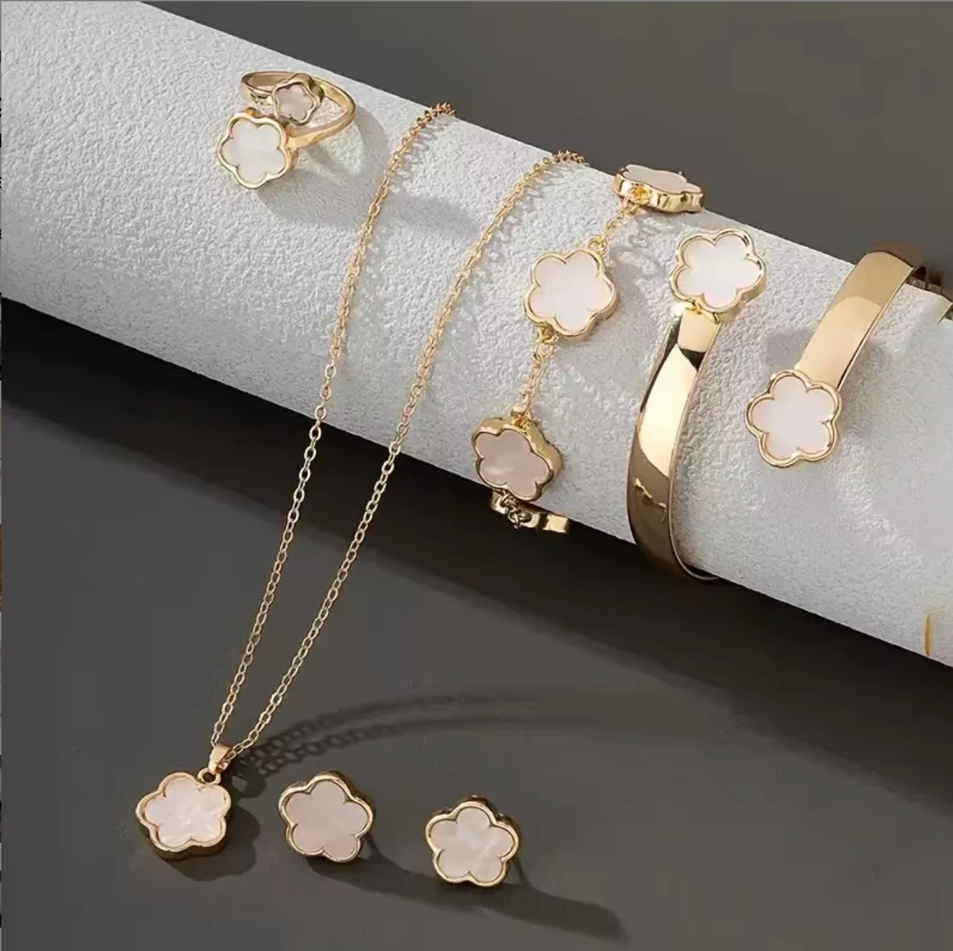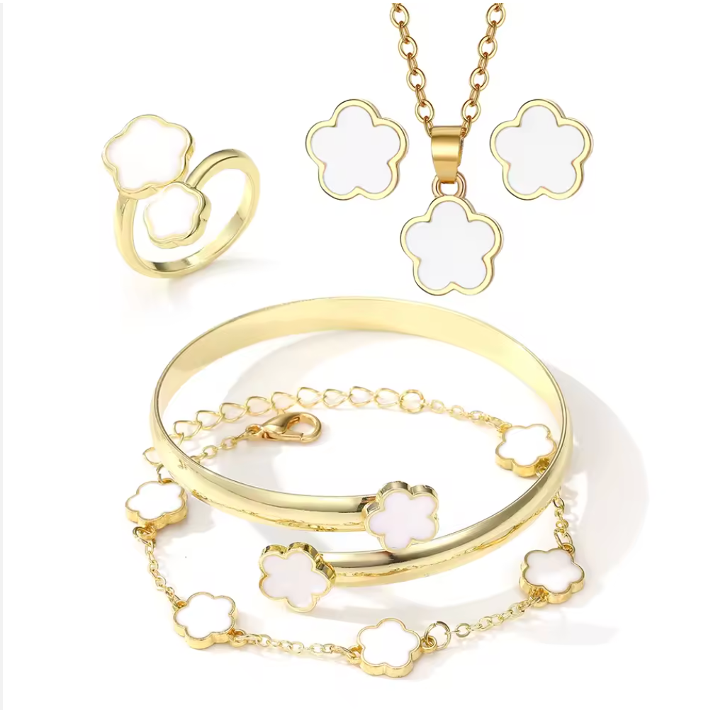 Celebrate timeless elegance with this five-petal flower five-piece jewelry set, beautifully designed in a refined European-American style. Crafted from gold plated alloy, this coordinated set includes a necklace, bracelet, and matching earrings, creating a polished and harmonious look for special occasions.