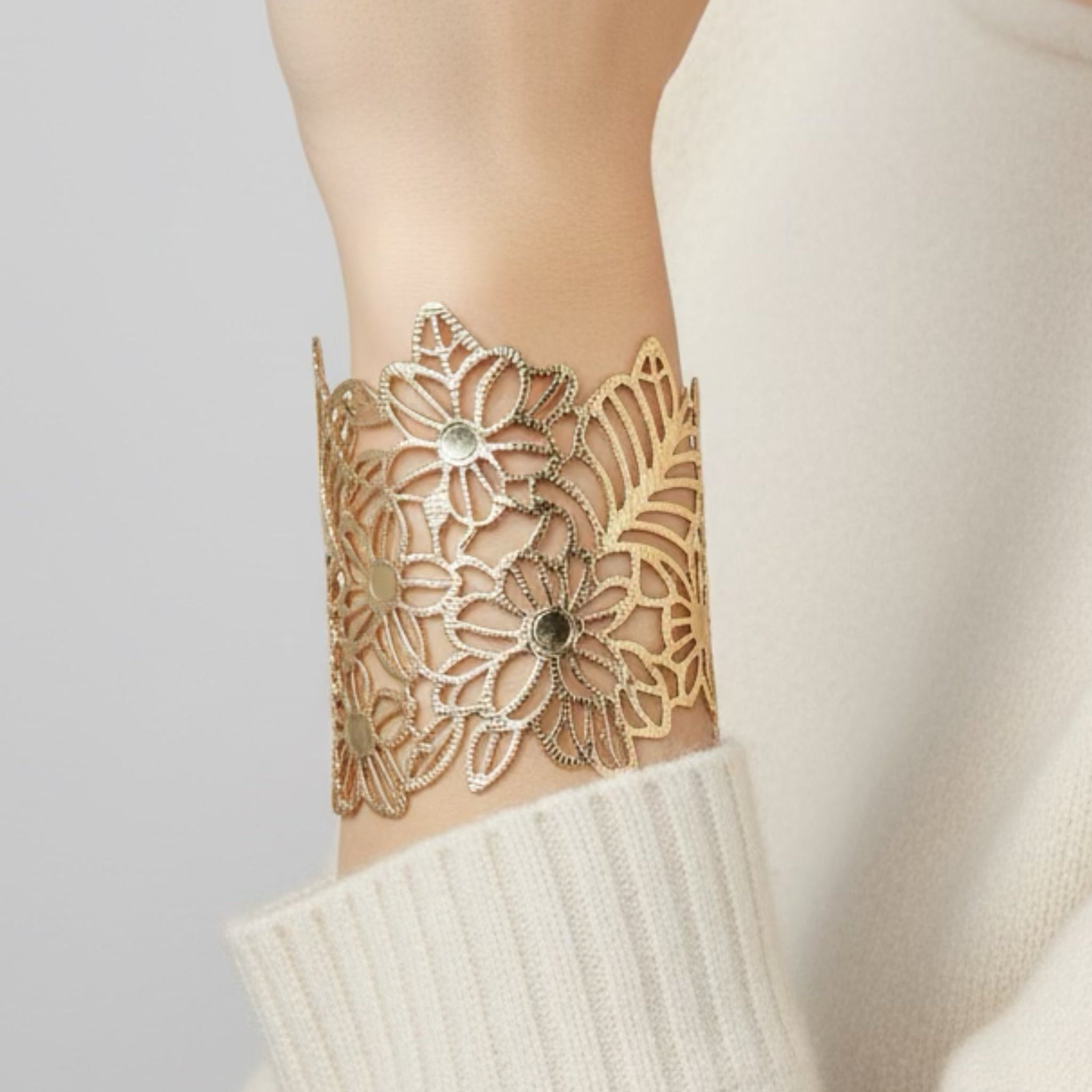 Make a bold statement with this chunky open wide cuff bangle, featuring a stunning hammered texture and an elegant hollow leaf and frosted flower wrap design. Crafted in a stylish gold and silver two-tone finish, this statement bracelet adds artistic flair and modern sophistication to any outfit.