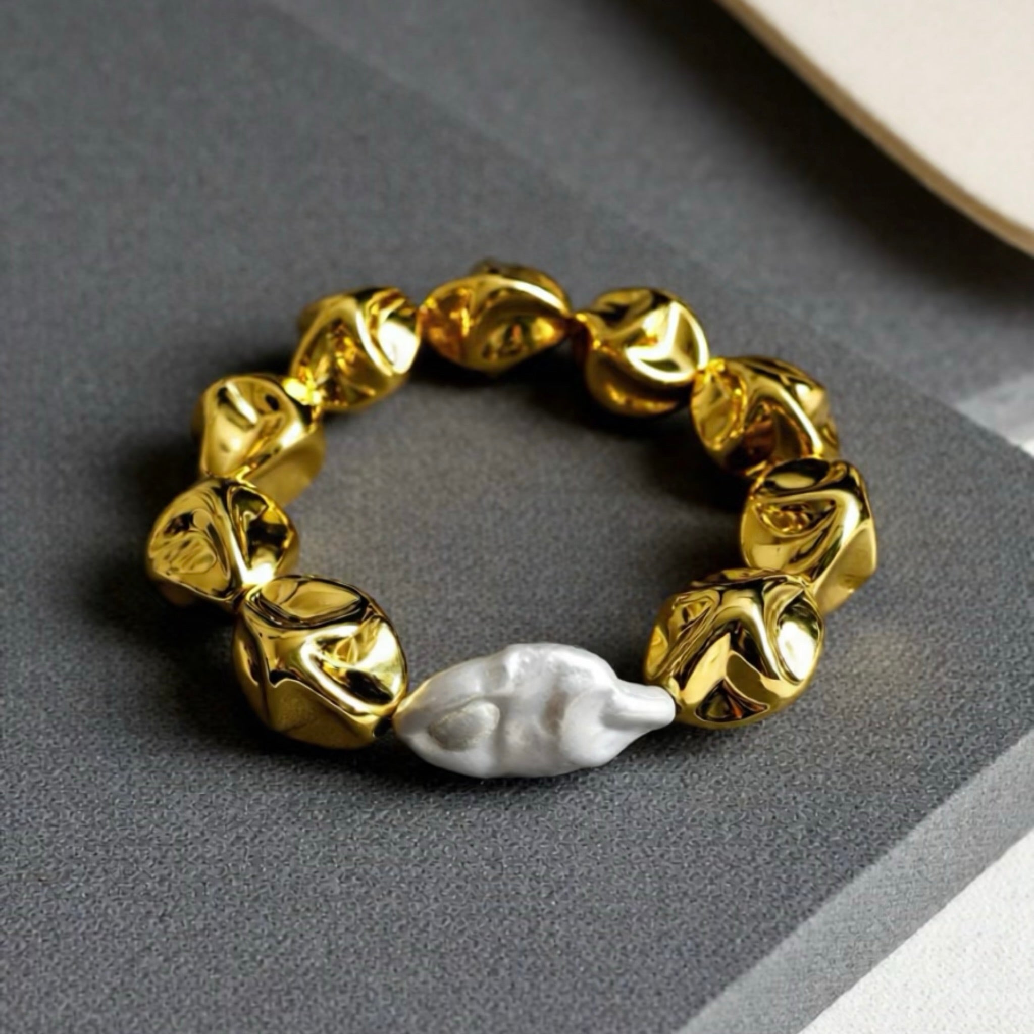 Elevate your jewelry collection with this stunning gold-plated Vertebrae Pearl Bracelet, designed to strike the perfect balance between elegance and modern edge. Featuring a series of textured gold links inspired by natural vertebrae forms and accented with a lustrous pearl centerpiece, this bracelet adds refined sophistication to any look.
